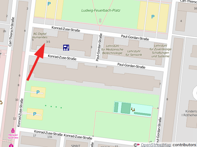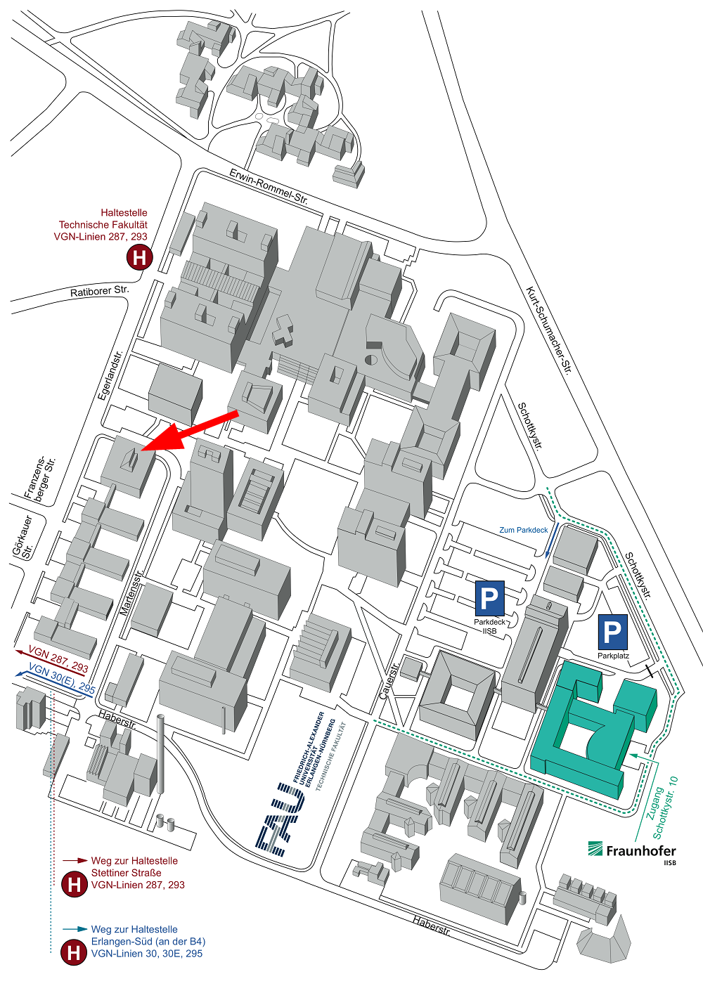 | Bushaltestelle: | Technische Fakultät (287, 293), Erlangen Süd (30/30E, 295) |